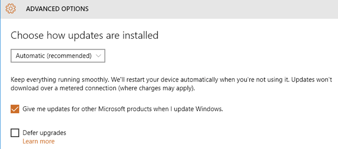 This will bring you to the Settings dialog on Windows Update. Click on Advanced Options and make sure the drop-down box says Automatic (recommended).