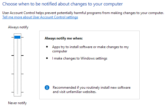 This is definitely a good option if you visit websites that are sketchy in nature. Keeping UAC to the highest setting will prevent certain changes from being made on your computer without your consent.