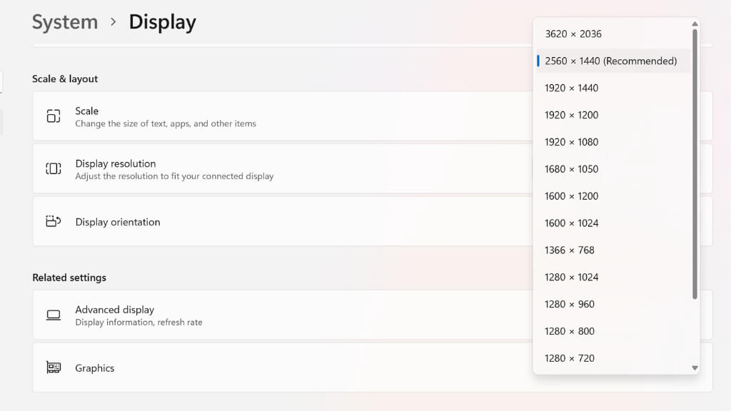On some laptops with a VRR (Variable Refresh Rate) display, you’ll also see “Dynamic resolution” as one of the resolution options. This is another great way to save battery power, where Windows will automatically adjust the refresh rate to match the content on-screen. It means you always get the optimal refresh rate for things like video playback, but on some laptops, this may cause visible flickering for some users.