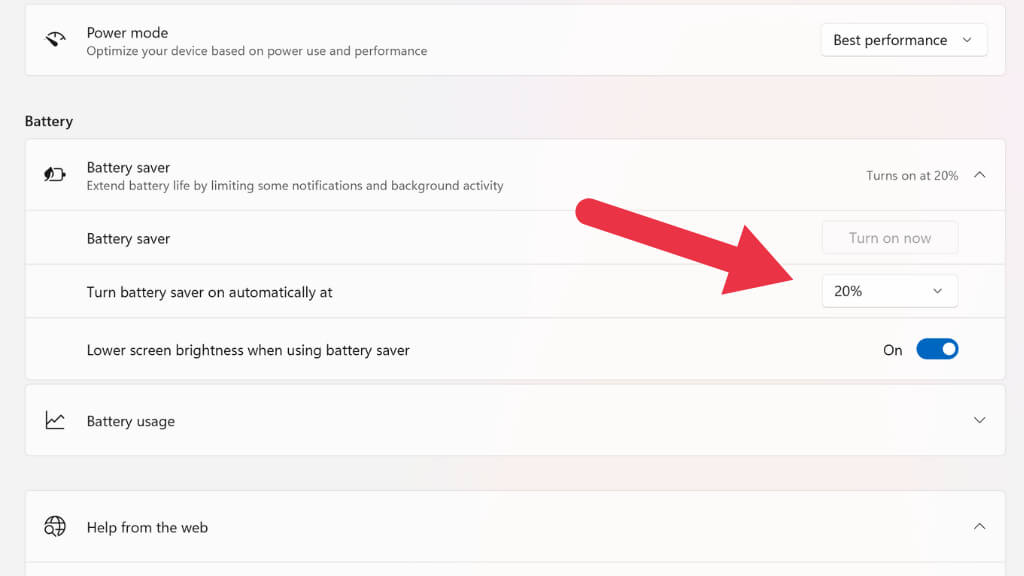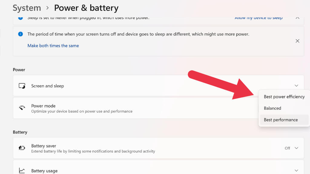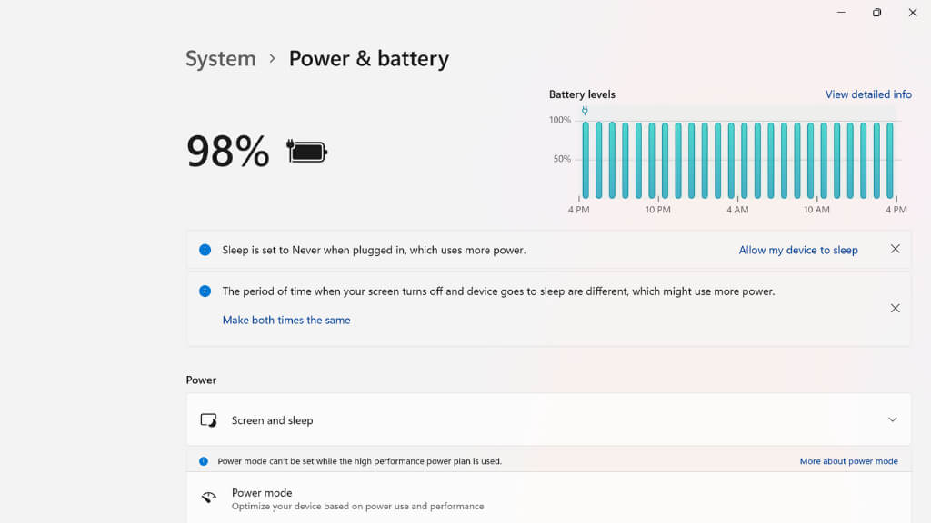 Try moving one notch down from your current power mode to increase battery life. If you switch to Best power efficiency, you may experience a little lag when doing some things on your laptop, but you should see a significant increase in battery life. The old power plans still exist in Windows 11, but Power Modes are easier to use and just as effective in our experience.