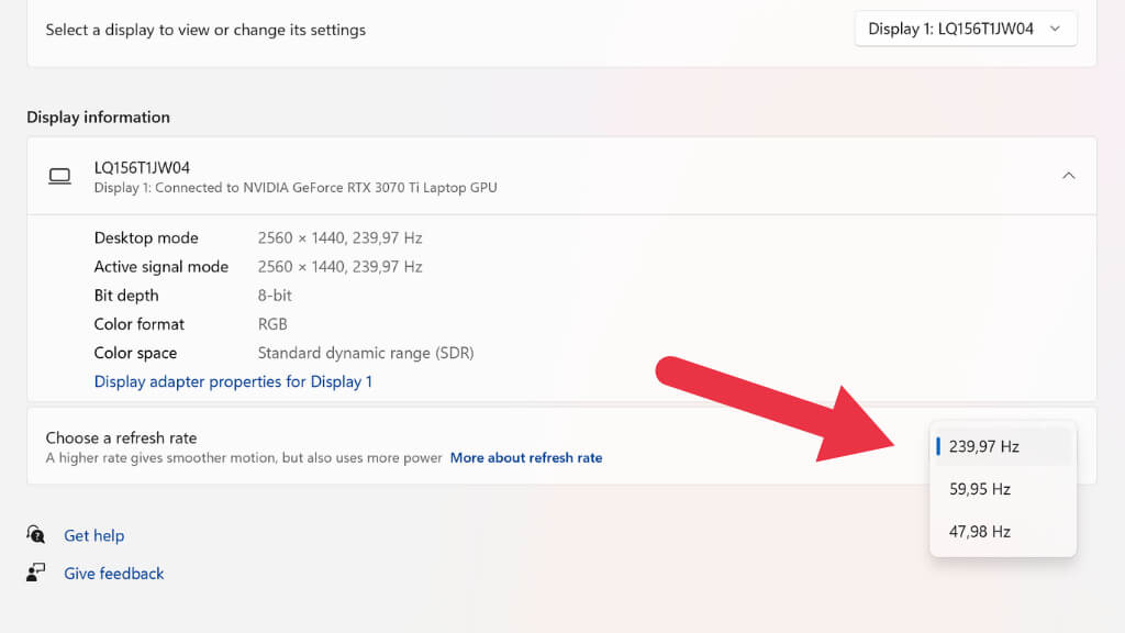 - Then under Choose a refresh rate, pick a lower refresh rate from the dropdown menu. 60Hz is a good general-purpose refresh rate for work or play, but you can go even lower than this on some laptops, which offers 48hz, 40Hz, 30Hz, and perhaps even lower refresh rate options. This will make motion less smooth, but if you’re doing office work or watching movies, it’s a great compromise to squeeze more life out of the battery.