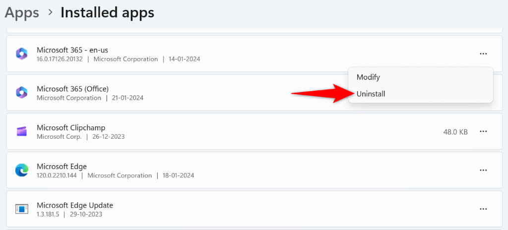 - Find Microsoft Office, select the three dots next to the app, and choose Uninstall.
