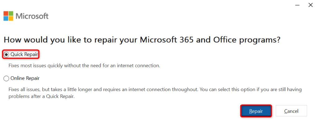 If you still get the above error, Outlook itself might be faulty. In this case, use Microsoft Office’s built-in repair tool to find and fix issues with your app. This tool helps you repair problems with other Office apps as well.