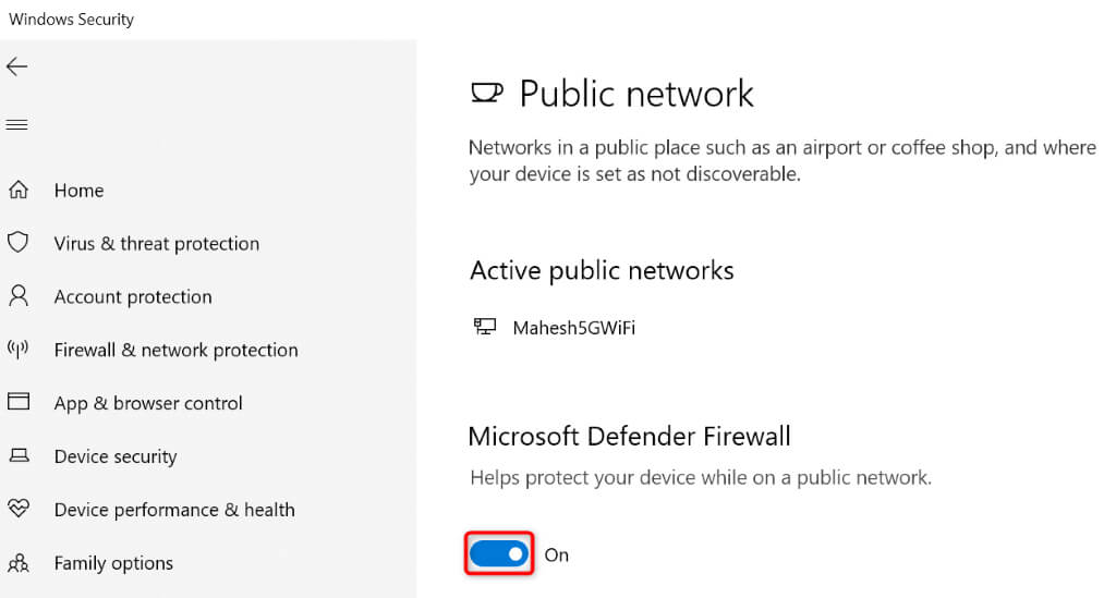 - Open the Windows Security app. * Select Firewall & network protection. * Select the network that says (active). * Turn off the Microsoft Defender Firewall toggle.