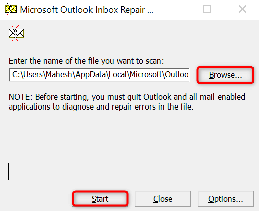 - Quit Outlook. * Open the Start menu, find Outlook, and select Open file location. * Right-click Outlook again and select Open file location. * Find and run the file named SCANPST.exe in the open folder. * Select Browse in the open tool, navigate to the path you noted above, and select your data file. * Choose Start in the tool to begin repairing the data file.