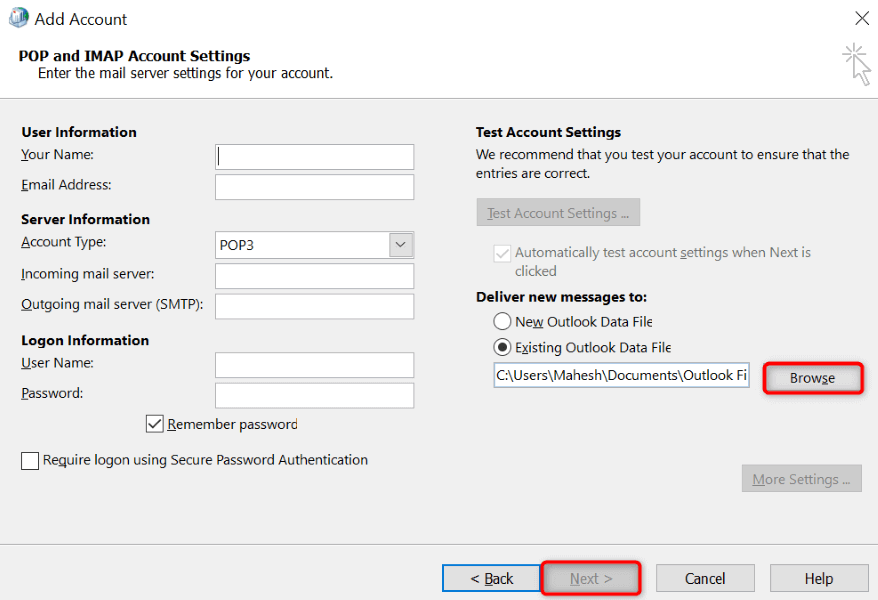 - Type a name for your new profile and select OK. You can use any name for your profile. * Select Manual setup or additional server types on the open window. * Specify your email account details. * Select Browse in the Deliver new messages to section and choose your Outlook data file.