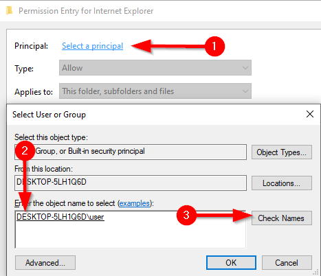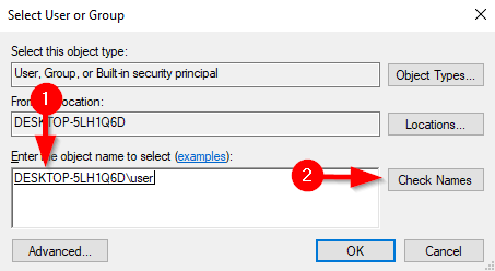 - Now, Windows will ask you to **Enter the object name to select**. Enter the user name you want to transfer the ownership to. * Click **Check Names **to complete the full object name and select **OK**.