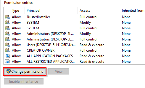 - Click **OK** to close the window. Then, open the window again by selecting **Advanced**. * Select **Change permissions** from the bottom left of the window.