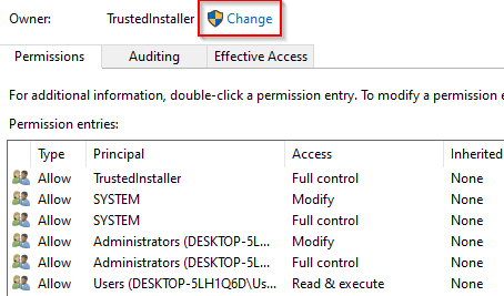 - A new window will open where you’ll see **TrustedInstaller **as the owner of the folder. Select **Change** to change the owner.