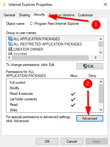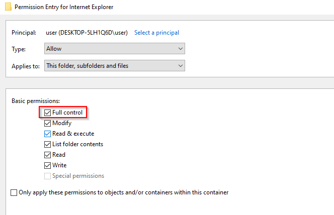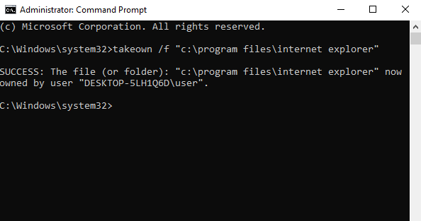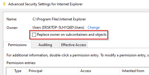 TAKEOWN /F “C:Program FilesInternet Explorer”