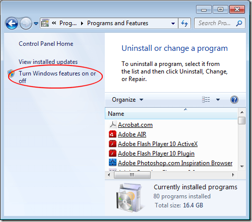 To the right of the window, click on the link titled Turn Windows Features On or Off. In Windows 10, just click on Start and type in “turn windows” and select the first option.