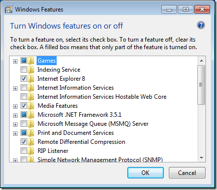 You should now be looking at the Turn Windows Features On or Off window. Here is where you can install or uninstall Windows features. Which features you can turn on or off depends on the version of Windows you have installed on your computer.