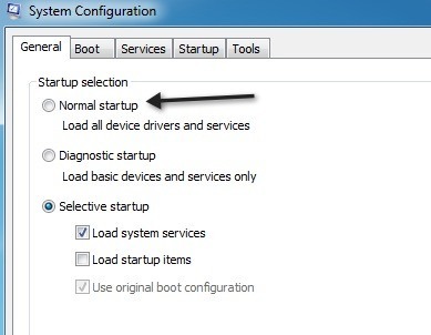 Once you know what program it is, go ahead and uninstall it. Uninstalling the program will also disable any services associated with that program. Then you can go back to the MSCONFIG utility and choose Normal Startup.