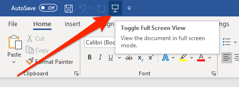- You’ll now find a new icon appearing in your Quick Access toolbar. Click on the icon and it’ll open your current document in full-screen mode.