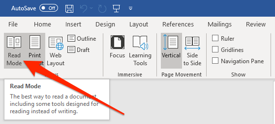 To access the read mode in MS Word, click on the View menu while your document is open and select the Read Mode option.