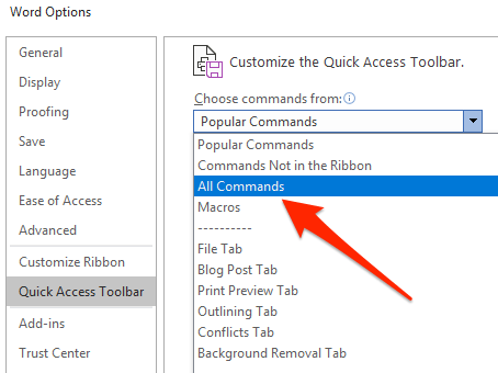 - The following screen lists the commands you can add to the toolbar but it doesn’t show all the commands by default. To make it show all available commands, select All Commands from the Choose commands from the dropdown menu.