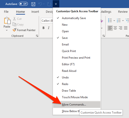 You can actually use the toolbar to make Word full screen. There’s a command that you can add to the toolbar which then when clicked, opens your document in full-screen mode. * Click on the small down-arrow icon in the Quick Access toolbar and a menu will open on your screen. Select the option that says More Commands from this newly opened menu.