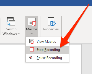 - Press Alt + V on your keyboard. Then click on the down-arrow icon in the Macros option in your toolbar and select Stop Recording.