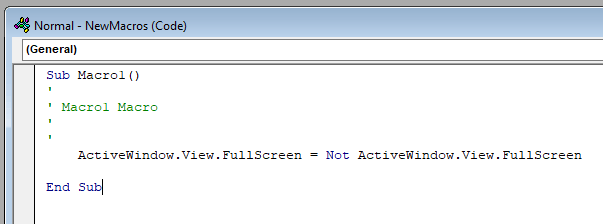 - Make sure your macro only contains the following code. You can copy and paste the following code in your macro if you want. Hit Ctrl + S to save changes. Sub Macro1() ’ ’ Macro1 Macro ’ ’ ActiveWindow.View.FullScreen = Not ActiveWindow.View.FullScreen End Sub