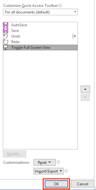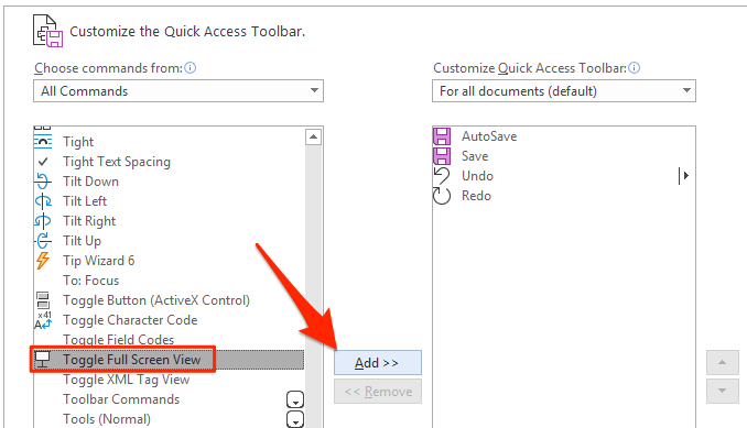 The icon for full-screen mode will continue to be there in your toolbar for all of your documents. If you ever want to remove it, you can do so by opening the pane you used to add the command, selecting the command in the right-hand side pane, and clicking Remove.