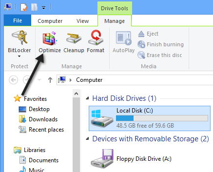 You can also get to the Optimize Drives feature by going to My Computer, selecting a drive, clicking on the Manage tab and then clicking on the **Optimize **button.
