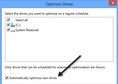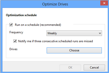 You can either remove the schedule so that automatic defragmentation is turned off or you can change it from weekly to daily or monthly. You can also choose all drives or a specific drive to change the schedule for. Lastly, if you click the Choose button, you can change whether you want new drives to automatically be scheduled for optimization also or not.
