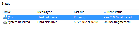 This will bring up the Optimize Drives dialog box where you will see a list of your drives and their current status (% fragmented).