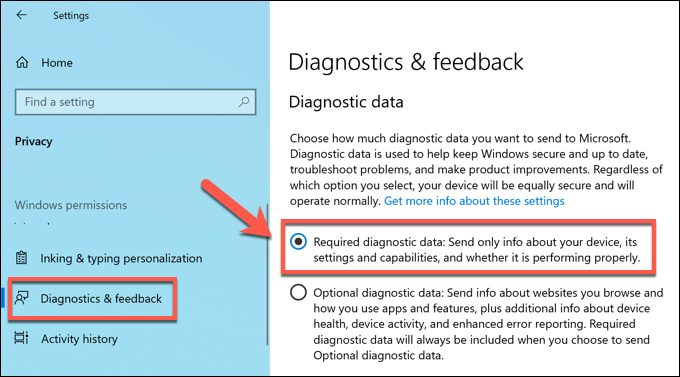 - In the **Settings** window, select **Privacy > Diagnostics & Feedback. **While it isn’t possible to completely disable diagnostic data collection, you can set it to a basic level of collection, which should help to reduce the impact on your PC. To do this, select **Required diagnostic data **(or **Basic** on older Windows 10 versions) from the **Diagnostic Data** options.