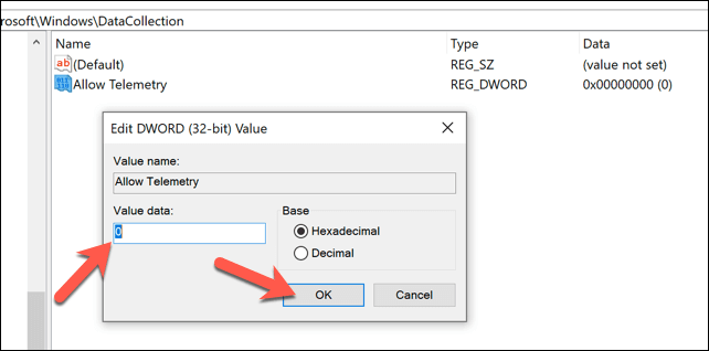 - Name the new value **Allow Telemetry**, then double-click it. In the options box, set the **value data** as **0**, then select **OK** to save.