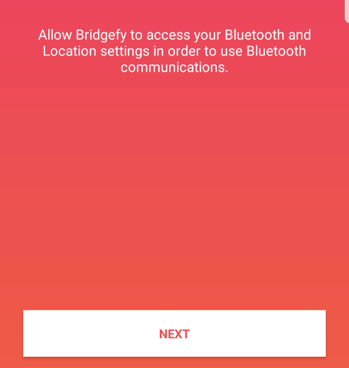 - Click Next in the new screen and give permissions for the app to access your Location settings to use Bluetooth communications, and your Contacts list.