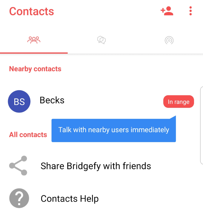 - If you tap on Contacts, you can see the people on your Contacts list who are already using Bridgefy. There’s also a Share button you can use to invite those who aren’t using the app yet. Next to each contact, you can see who is nearby that you can get in touch with. A red bubble with the words In Range will show besides each contact who is closer to your current location.