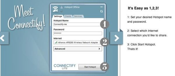 Once installed, you just name your network, type a password, and choose the Internet connection to share. Sounds similar to what we did above right? Connectify just provides a nice interface for doing the same thing.