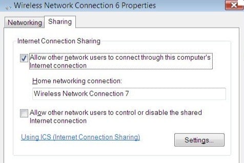 In the drop-down under Home networking connection, make sure to pick the name of the virtual WiFi mini port adapter. It may be something like Wireless Network Connection 2 or 3, etc. Now to setup the wireless access point on the virtual network adapter, open the command prompt (Start, type cmd) and type in the following command: netsh wlan set hostednetwork mode=allow ssid=VirtualNetworkName key=Password
