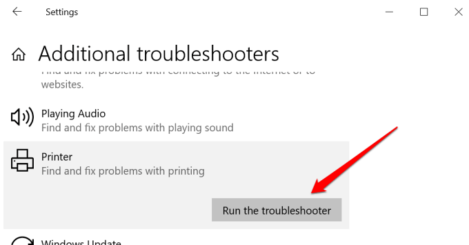 Windows has a dedicated troubleshooting tool for diagnosing and fixing printer-related problems. To access the tool, go to Settings > Updates & Security > **Troubleshoot **> Additional troubleshooters > Printer and select Run the troubleshooter.