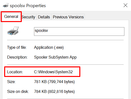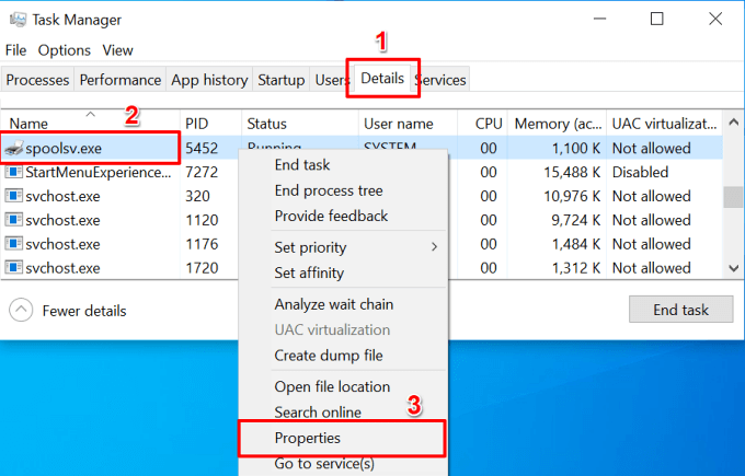 Alternatively, go to the Details tab, right-click spoolsv.exe, and select Properties.