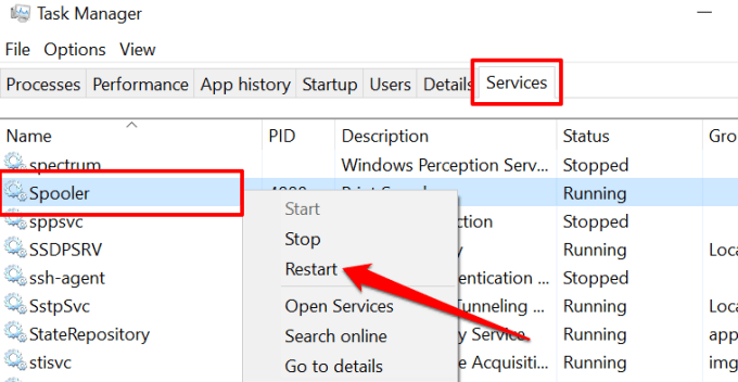 Launch the Task Manager, go to the Services tab, right-click Spooler, and select Restart.