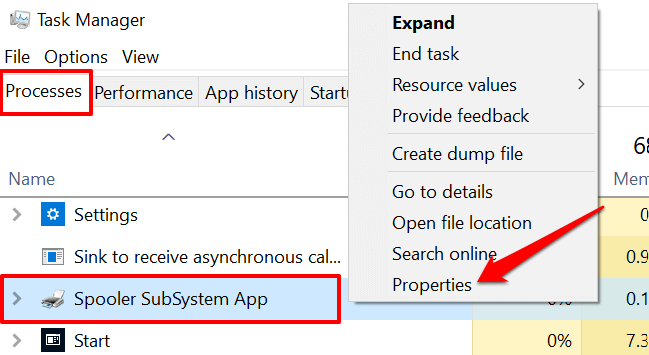 - Open the Task Manager (Ctrl + Shift + Esc), right-click Spooler SubSystem App in the Processes tab, and select Properties.