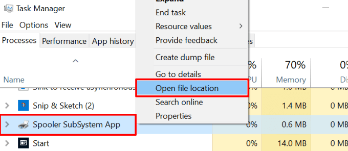 - Right-click the Spooler SubSystem App in the Task Manager and select Open file location.