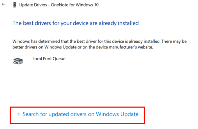 That’ll prompt the Device Manager to check your PC’s Windows Update history for an updated version of your printer’s driver.