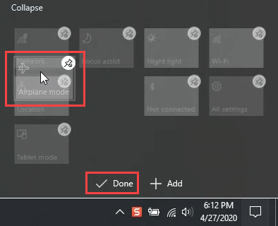 Don’t like where the Airplane Mode tile ended up? That’s okay. Just click and hold it, and drag it to where you want it. Once you’ve got all the actions where you want them, click on the **Done **button to commit the changes.