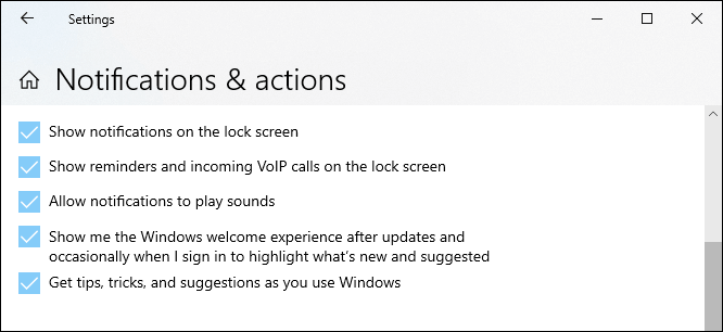 Scroll a bit further and you’ll see that you can control where and how notifications are made. They could show on the lock screen, play sounds, and provide random helpful Windows tips.