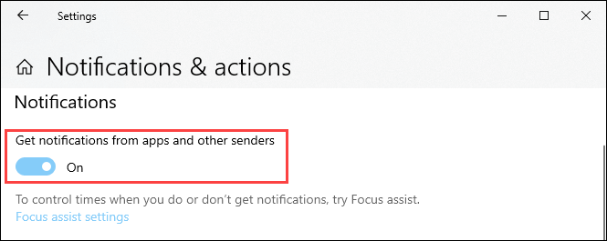 The **Notifications and Actions **settings window will open. Scroll down to the **Notifications **section and click on the sliding button under Get notifications from apps and other senders. That will turn off all notifications.