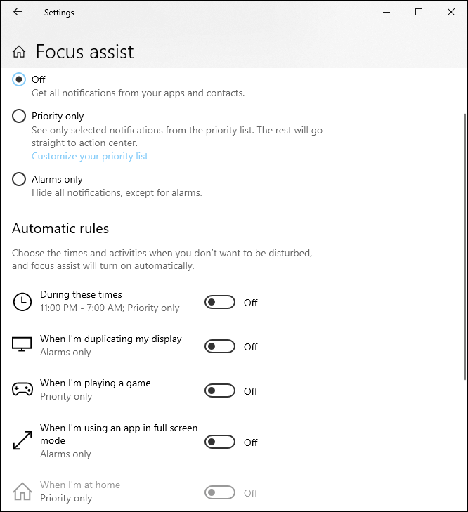 You can also fine-tune notifications. Just scroll down a bit further to see your options. You can turn notifications from individual apps on and off. You can also use the **Focus assist **settings to be more specific about the alerts you get. Perhaps the nicest feature is the scheduling feature under During these times. That really allows you to have the best of both worlds.