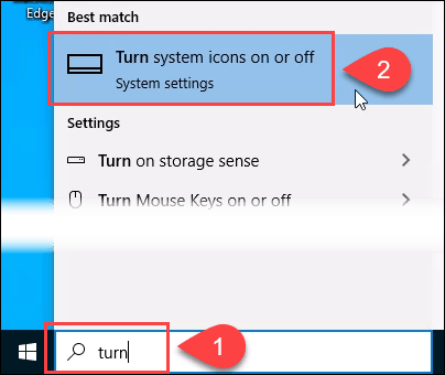 In the system Search bar, start typing turn system icons. It will return a match of Turn system icons on or off. Click to go to that Settings page.