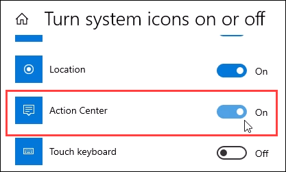 Find the **Action Center **on the page and click on the slider button next to it. It will change from On to Off. Now look in the system tray where Windows Action Center was and you’ll see it’s now gone.