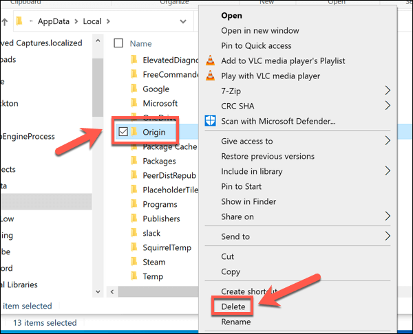 - In the **Local** folder, right-click the **Origin **folder and select **Delete**.