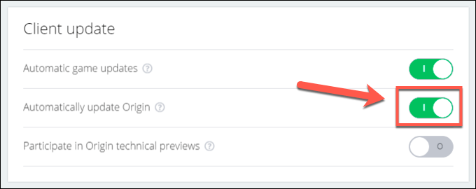 - If automatic updates is enabled in either Origin or EA Desktop, switch the setting off and on again by selecting the slider twice. This will force EA’s apps to check for updates.