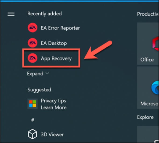 - If EA Desktop doesn’t open, you can launch App Recovery manually by selecting the **Start menu** > **App Recovery** (with the EA logo) to launch it instead.