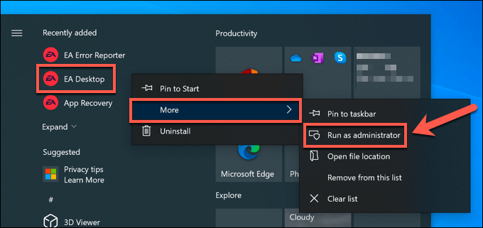 - To launch Origin or EA Desktop in administrator mode, select the Start menu and locate **Origin **or EA Desktop (depending on the app you’re using). Right-click the entry and select **More **> Run as administrator.
