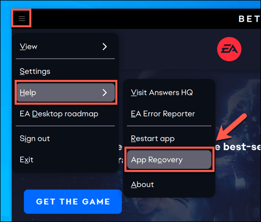 - To clear cache files in EA Desktop, open the EA Desktop app and select the **menu icon** in the top-left. From the menu, select **Help **> **App Recovery**.